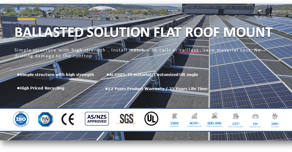 Il sistema di montaggio su tetto piatto con treppiede di zavorra è relativamente facile da installare e può essere eseguito rapidamente, il che può ridurre i tempi di installazione e i costi di manodopera. Il sistema di montaggio su tetto piatto con treppiede di zavorra è una soluzione efficace ed efficiente per le installazioni di pannelli solari su tetto piano che richiedono stabilità e sicurezza senza la necessità di penetrazione nel tetto.