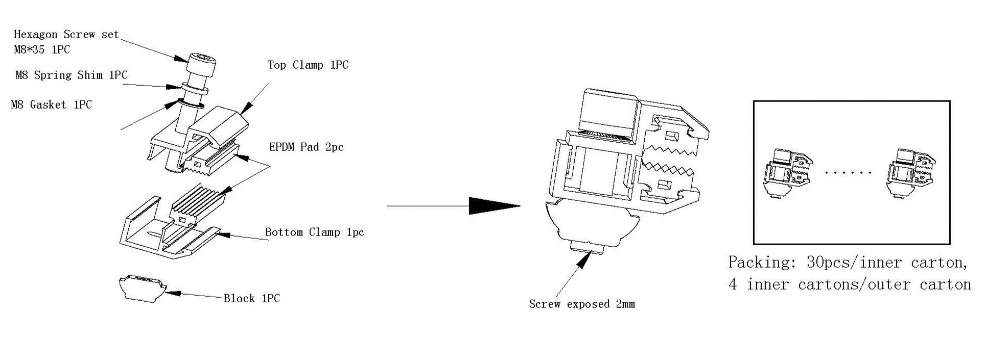 Il morsetto terminale per film sottile per pannello solareè realizzato in alluminio AL6005 - T5, combinato con EPDM pastiglie, fissare saldamente il frameless pannello su binari. è realizzabile per i pannelli a film sottile con spessore 6 - 10mm. Pre - assemblato in fabbrica quale salva tuo tempo di installazione in loco e cost.