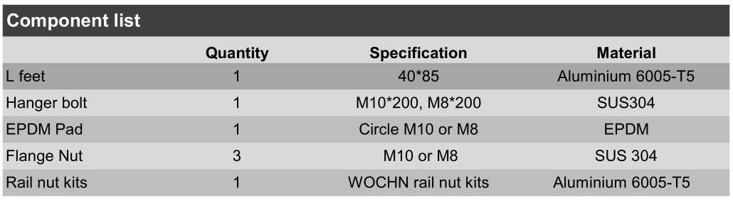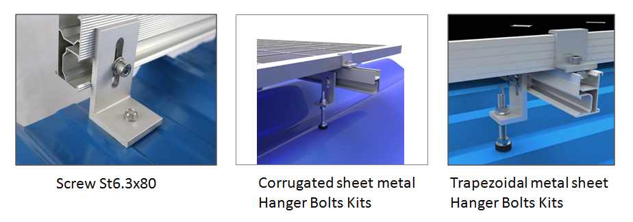 Staffe con piedi a L applicate principalmente su coperture in lamiera trapezoidale e lamiera grecata . Può essere fissato direttamente sulla trave del tetto con una vite. Il bullone di sospensione e la vite St6.3x80  si applicano per l'installazione su  trave in acciaio e trave in legno. Rendere l'installazione più veloce, competitiva e affidabile. I sistemi sono pienamente conformi agli standard internazionali sul carico di vento e neve.