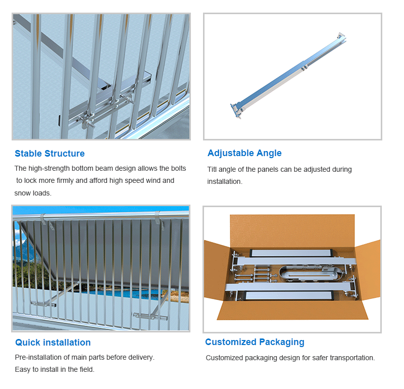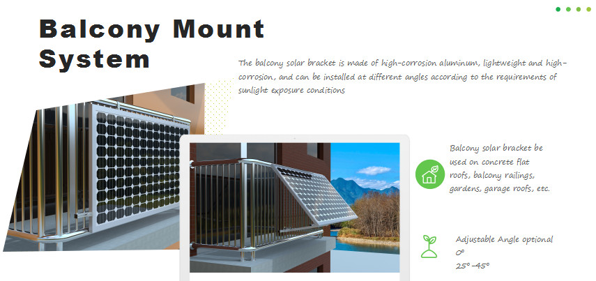 Il sistema di montaggio solare per balcone è realizzato in alluminio ad alta corrosione, leggero e ad alta corrosione e può essere installato con diverse angolazioni in base ai requisiti delle condizioni di esposizione alla luce solare. La staffa solare per balcone può essere utilizzata su tetti piani in cemento, ringhiere di balconi, giardini, tetti di garage, ecc.