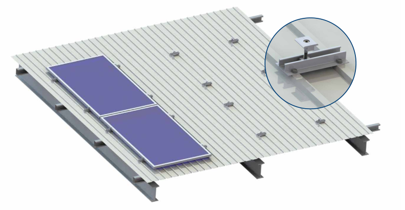 Le guide leggere possono essere installate su tetti in metallo, la struttura a forma di U è una combinazione di guide e morsetti. basso costo e rapida installazione. Rivettato o avvitato su ondulazioni rialzate.